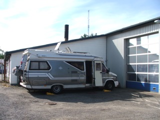 paar hundert Meter zu einer kleinen Autowerkstatt, statt uns zurück bis nach Nakskov zu schleppen. Hier mussten wir zwar auch bis Montag warten, aber wir hatten einen ruhigen Stellplatz mit Strom im Hof der