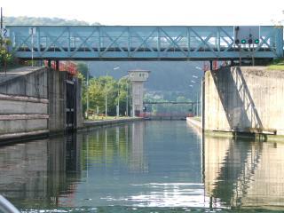 vor, denn der Fluss ist um einiges breiter als der Kanal. Wir hatten dann auch sofort das Erlebnis einer echten Berufsschifffahrtsschleuse… mit über 100 m Länge und 12 m Breite ganz für uns allein… als wir