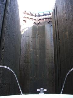 rein…ganz schön beklemmendes Gefühl, denn diese Schleuse überwindet 15 m Höhenunterschied und man kommt sich schon ziemlich klein und hilflos in dem Riesending vor, vor allem wenn die Tore endgültig zu sind.