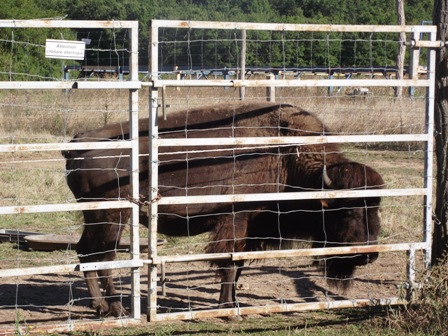 vorderen Weiden nur eine Bison-Kuh mit ihrem Kalb. Alle weiteren scheinen in der Landschaft verstreut zu sein. Da wir jedoch für heute genug zu Fuß unterwegs waren und auch unser Hund nicht so gut dabei ist,
