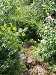 mussten, denn die Bahn lag über uns. Das wussten wir ja von der Hinfahrt. Wir durchquerten noch ein Tal mit einem Fluß und kämpften uns wieder bergan. Wir erreichten die Station ca. 1 Stunde vor der Abfahrt des