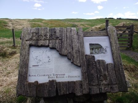 Fußmarsch, der aber gut zu bewältigen ist, kommt man an die Stelle der früheren Siedlung Rosal, die wegen der Clearences aufgegeben werden musste. Anhand der Geschichte einer Familie wird das Leben vor und nach