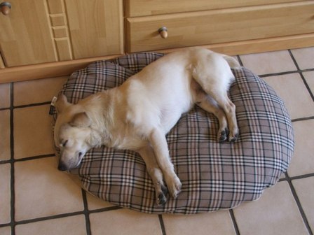 Ballspielereien ist er ganz fertig auf seinem Kissen eingeschlafen.