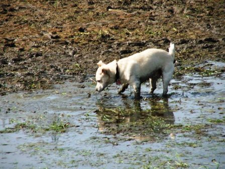 Ben ist ein fürchterlich wasserscheuer Hund, obwohl er immer wieder neugierig um Tümpel und Bäche schleicht. Hier hat